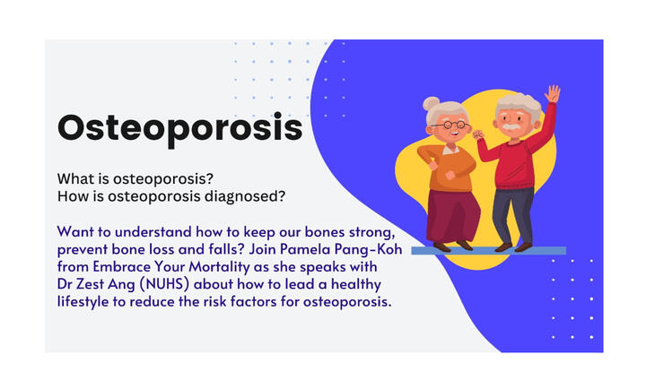 Want to understand how to keep our bones strong, prevent bone loss and falls? Join Pamela Pang-Koh from Embrace Your Mortality as she speaks with Dr Zest Ang (NUHS) about how to lead a healthy lifestyle to reduce the risk factors for osteoporosis.
